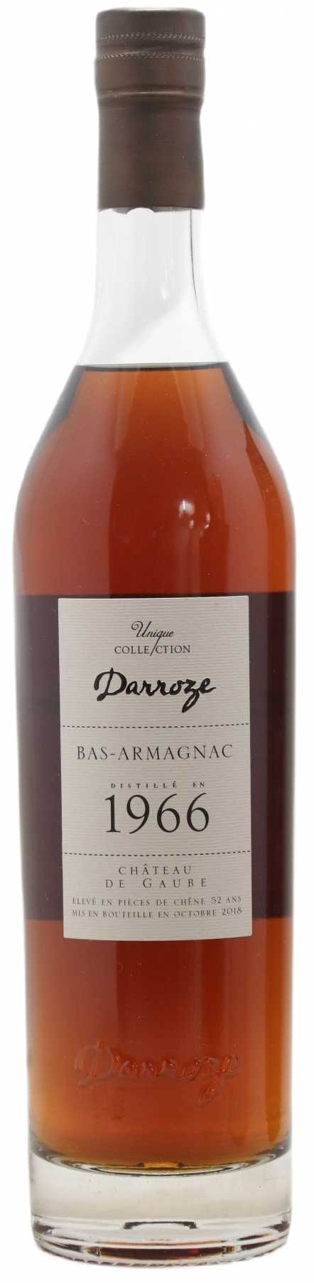 Darroze 1966 Chateau de Gaube je ultra-prémiový armagnac z kolekce Unique Collection. Ta je v mnoha ohledech unikátní. Stáčení probíhá na základě objednávky a stáří je tedy určeno datem lahvování. Nikdy však není kratší než 15 let. Jedná se o tzv. „single cask vintage“ armagnac. Armagnac z kolekce Unique je vždy pouze z jednoho sudu a plněn v sudové síle bez dalších úprav. Každý ročník pak pochází z jiného vinařství, kterých má rodina Darroze k dispozici přes 30. Bas Armagnac Darroze 1966 Chateau de Gaube je skutečným klenotem pro opravdové znalce a luxusním dárkem.