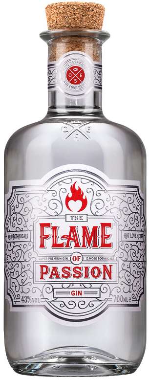 Gin je hlavně o přírodních rostlinných složkách, který jako jediný obsahuje bylinky lásky (afrodiziaka), jako jsou damiána, ženšen a guarana. Tyto bylinky a další rostlinné složky použité v ginu tvoří nápoj lásky, který udrží romantiku v pohybu. Ve srovnání s mnoha květinovými giny je trochu pikantní s tóny skořice a pepře. Flame of Passion Gin je mistrovsky destilován v Holandsku v 50 let staré měděné nádobě. Všechny destiláty se destilují samostatně a nechají se alespoň dva týdny uležet.