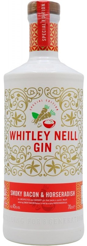 Whitley Neill Smoky Bacon & Horseradish Gin je unikátní destilát, který překvapí kombinací uzené slaniny a křenu. Tento gin z dílny renomované značky Whitley Neill nabízí nečekaný a výrazný chuťový zážitek, který je dokonalým doplňkem jakéhokoliv koktejlu. Whitley Neill Gin je prémiová značka ručně vyráběných ginů inspirovaných celým světem, vyráběná v srdci Londýna. Historie rodiny Neill sahá až do roku 1762, kdy Thomas Greenall založil Greenall's Distillery. Johnny Neill, osmý generace destilatér, založil značku Whitley Neill v roce 2005, inspirován svými cestami a rodinnou tradicí
