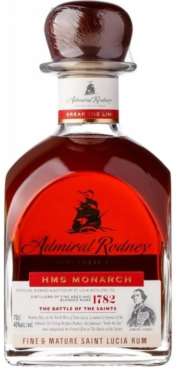 ADMIRAL RODNEY MONARCH je lahodný a plný rum ze Svaté Lucie v Karibiku. Jedná se o směs 6 až 9 let starých rumů. Zraje v amerických dubových sudech, které se dříve používaly jak pro bourbon, tak pro portské víno. K jeho výrobě se používá tradiční dvousloupcový destilační přístroj „Coffey Still“. Rum má hlubokou mahagonovou barvu a vůně je prokládaná tóny rozinek, vanilky a jemnými náznaky červených bobulí. V chuti cítíte jemné tóny hnědého cukru, kandované ovoce, tropické koření. Na konci dochuti je také cítit dubové a tropické koření. To vše v chutném, vyváženém a komplexním zážitku.