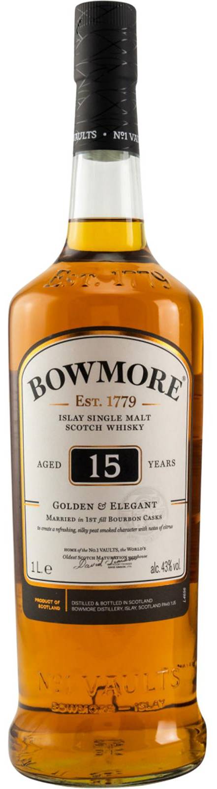 Bowmore 15yo Golden Elegant byl prvně vložen do sudů po Bourbonu. Z toho má osvěžující, inspirovaný a povznášející charakter. Sytě zlatá až jantarová barva, chutná až do mořské slanosti, je čistá, saténově jemná. Sladké stopy sherry.