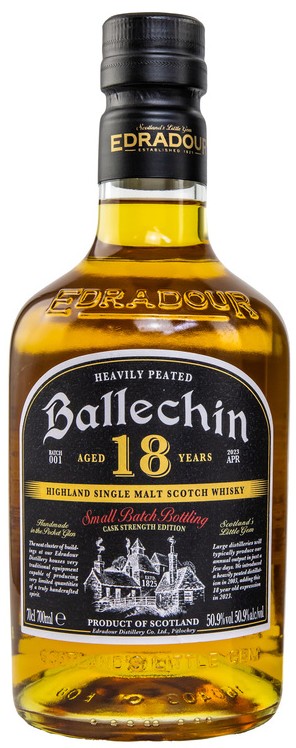 Palírna byla založena roku 1825 několika zdejšími farmáři, jméno Edradour pak používá od roku 1837. Toto pojmenování pochází z gaelského Edred dobhar, což znamená „Pramen krále Edreda“. Po roce 2002, kdy palírnu koupila společnost Signatory, byla na trh uvedena řada speciálních ročníkových sérií. Rašelinná verze whisky Edradour se stáčí pod obchodním jménem Ballechin. Aroma téhle whisky je někdy přezdíváno jako „hell of peat“ (rašelinové peklo). Na první dobrou cítíte kolomaz, dřevěné železniční pražce, uzené mandle, komín a spousta dehtu. A přitom vše působí velmi hladce a přitažlivě. Chuť je expresivní, ale uhlazená a harmonická – exotické ovoce, slad a třtinový cukr Demerada. Spousta pikantního charakteru v kombinaci sladké a slané. Přidejte si tedy uzené maso, barbecue omáčku, pak mandle a hořko čokoládu, sladké pomeranče a sůl.