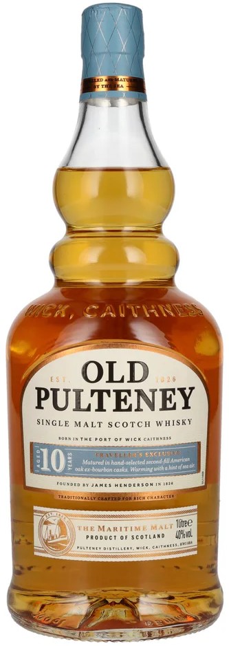 Tam je město na nejsevernějším břehu Skotska, kde se Severní moře setkává s pobřežím Caithness. Domov whisky, která zachycuje podstatu jejího umístění. Toto je Wick a Old Pulteney; mořský slad. S tradičními ložisky vystavenými osvěžujícímu mořskému vzduchu proudícímu ze Severního moře zachycuje Old Pulteney chuť moře v každé kapce tekutého zlata. Od jemných pobřežních akordů po jasnější slané tóny, chuť whisky Old Pulteney hodně vypovídá o roli a vlivu regionu. Příjemný a teplý single malt, který zraje 10 let a jasně odráží slavný charakter klasické Old Pulteney. Bohatá sladkost plynule přechází s kořeněným citrusovým ovocem a vede k vyzrálému bohatství chutí.